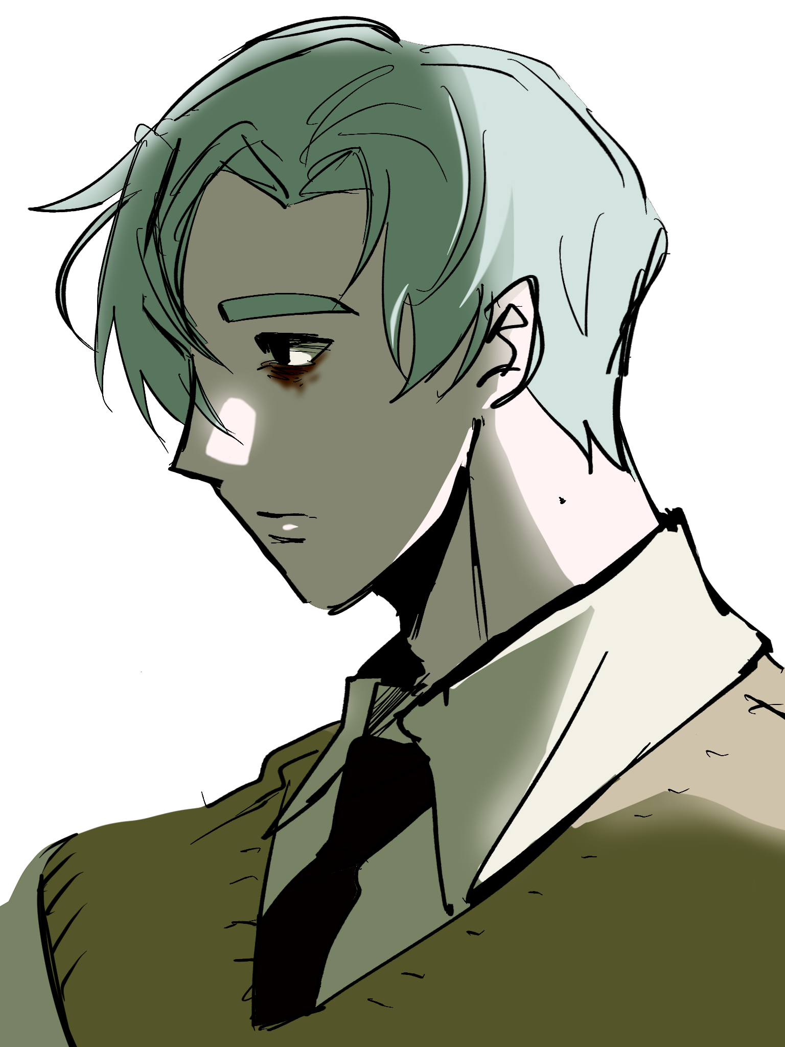 반깐머리인 회색빛 녹발. 피부가 매우 하얗고 흑안을 가지고 있다. 눈물자국과 다크서클이 심하다. 언제나 단정한 복장을 하고 다닌다.